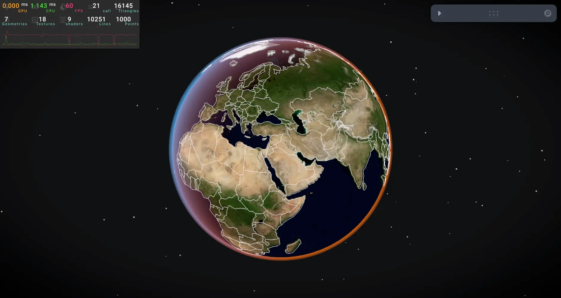 Basically they are another layer on top of our sphere (similar to the Atmosphere) but they are not a mesh, but a colleciton of Lines - to implement it you will need GeoJSON file and to apply them in Drei, for more information you can look at the source code. after implementing it you will have the result as the image in the beginning of the section !